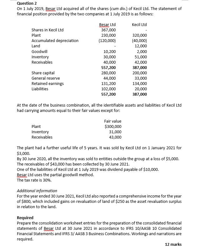 Question 2 On 1 July 2019 Besar Ltd Acquired All Of Chegg Com
